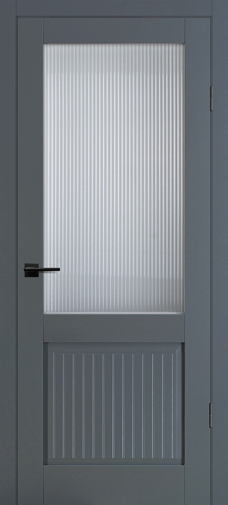 Полотно комплектуется объемной филенкой с фрезерованным рисунком "под рейку". В остекленных полотнах используется рифленное стекло с красивым прокатным узором в виде полос. Отлично смотрится в неоклассических и лофтовых интерьерах.