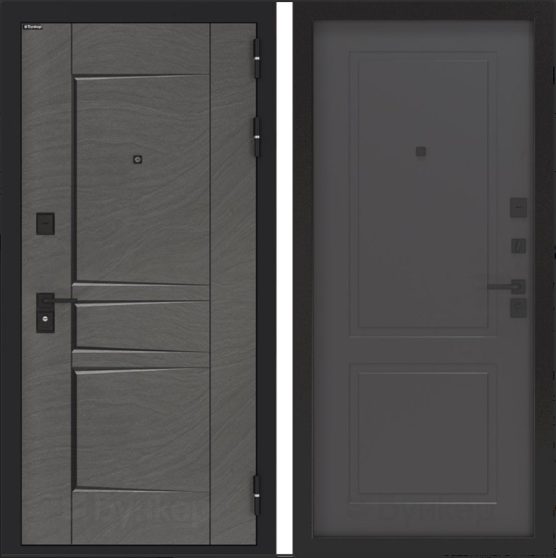 Черная матовая: Броненакладкая, сувальдные накладки со шторкой, ручка, ночник, цилиндр ключ-вертушка, глазок по центру или сбоку