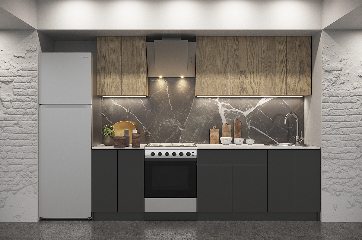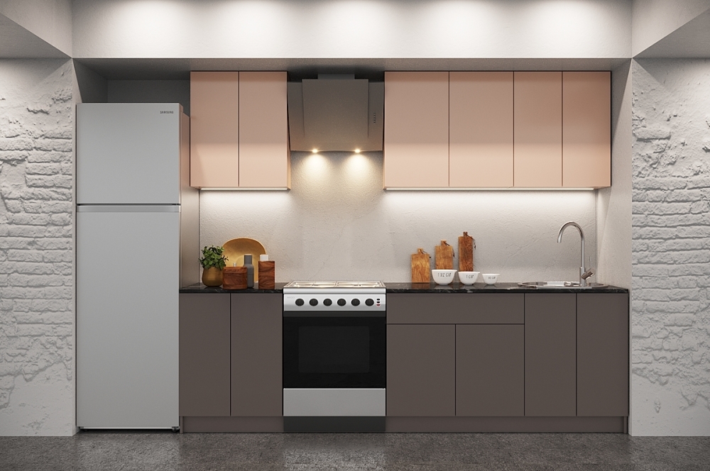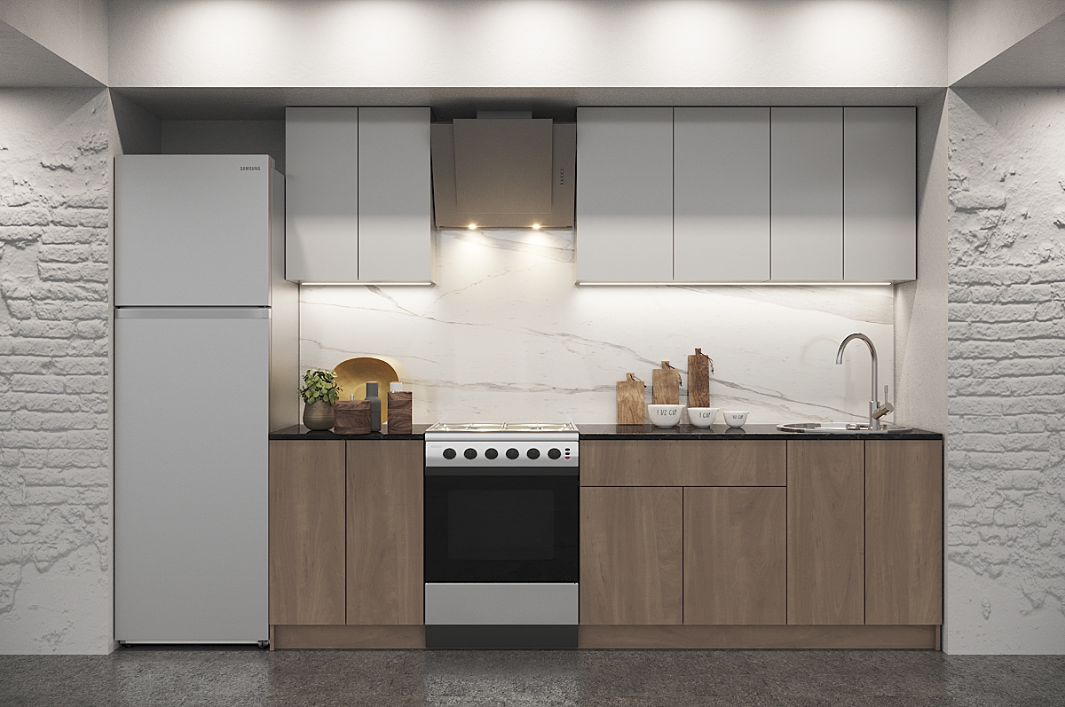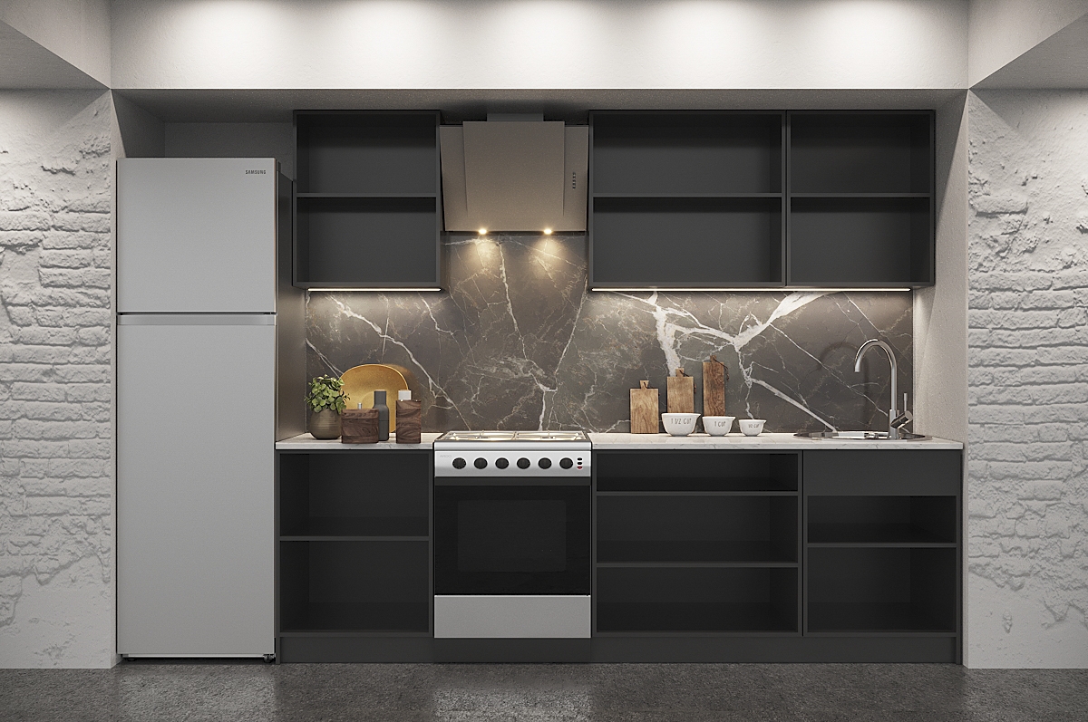 Ручки, столешница, стеновая панель, мойка, смеситель и бытовая техника продаются отдельно.